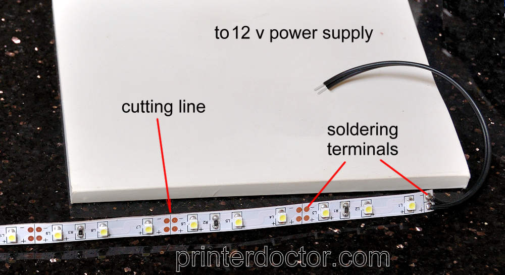 These LED strips produce bright light and suitable for many applications. We carry 16.4 ft long and 8.2 ft strips. They made on flexible printed circuit board with 3528 SMD LEDs 120 degree light dispersion angle. 16ft 5" strip made of 300 LEDs consuming only 20 watt (12 volt 1.6 amp DC), emit light equal to 150 watt incandescent light bulb (Warm white strip color temperature is 2700-3000K similar to bright white CFL sold in stores, Pure white strip color temperature is 4000K-4500K similar to direct Sun light)! Please select color desired using drop down menu. These strips are made as flexible printed copper circuit boards less than 3/8" wide and only 1/8" thick with 3M self adhesive back. Strip can be cut every 1 -7/8" (3 LEDs) each part can be soldered and powered by the same or additional 12 volt power supply. LEDs spaced less than 5/8" apart, 19 LEDs per ft. White and Warm white strips are perfect for kitchen under cabinet lighting, glass door cabinet lighting, picture, Blue, Green, Red, Yellow-Amber for accent and decorative lighting. Please do not confuse with low power rope lights: these made with very bright SMD LEDs and you'll need 12 volt regulated power supply capable of at least 1.5 Amp (1500 mA) output. We recommend our