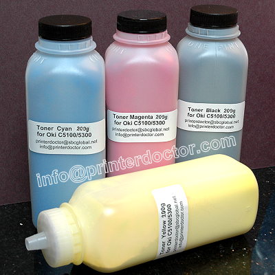 Save over $110.00 on each color ! Developed specifically for Oki ® C3200, C5000 series printers, and extensively tested by hundreds wise Oki owners. Any color toner sealed in bottles: Yellow, Magenta, Cyan or Black high quality 100% compatible color toner to refill corresponding toner cartridge of your Okidata ® C3200n, C5100n, C5150n, C5200n, C5300n, C5400n, C5400tn, C5400dtn, printer. These are dry powder 200g any color and equal full (not starter) cartridge refill and will last as long as high capacity toner cartridges: 42127401 , 42127402 , 42127403 , 42127404 (5000-6000 pages at 5% coverage and four time more than $60.00 cartridges for c3200: 43034801 , 43034802 , 43034803 , 43084804) and produce accurate colors with soft gloss output. Each bottle will fill up one empty cartridge. If you plan to refill