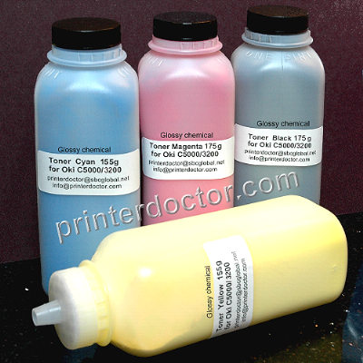 Save over $100.00 on each color! Developed to match original toner of Oki ® C3200, C5100-5400 series printers, and extensively tested. Any color toner sealed in bottles: Yellow, Magenta, Cyan or Black high quality compatible color toner to refill toner cartridge used in Okidata ® C3200n, C5100n, C5150n, C5200n, C5300n, C5400n, C5400tn, C5400dtn color printer. These are dry powder 160g (sligtly vary by color)and equal High Capacity (not starter) cartridge refill and will last as long as high capacity toner cartridges: 42127401, 42127402, 42127403, 42127404 (5000-6000 pages at 5% coverage and four time more than $70.00 cartridges for c3200: 43034801, 43034802, 43034803, 43084804) and produce accurate colors with high gloss output. Each bottle will fill up one empty cartridge. If you plan to refill
